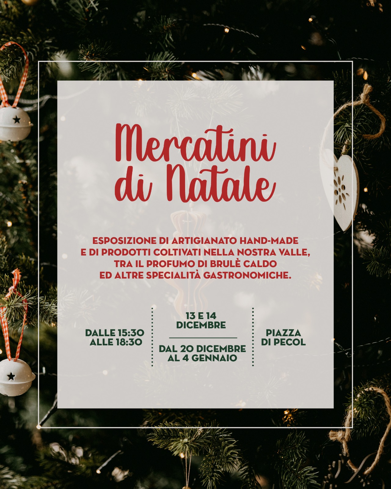 | 0 eventi, | 0 eventi, | 0 eventi, | 0 eventi, | 0 eventi, | 1 evento, ![]() 13 e 14 Dicembre 2025 - dal 20 Dicembre al 4 Gennaio Nei giorni 13 e 14 dicembre e dal 20 dicembre al 4 gennaio, si svolgeranno il mercatino di Natale nella piazzetta di Pecol, in Val di Zoldo. Ogni pomeriggio dalle 15:30 alle 18:30, potrete scoprire l'artigianato locale e le specialità coltivate nella zona. L'atmosfera festiva sarà arricchita dagli… | 1 evento, |